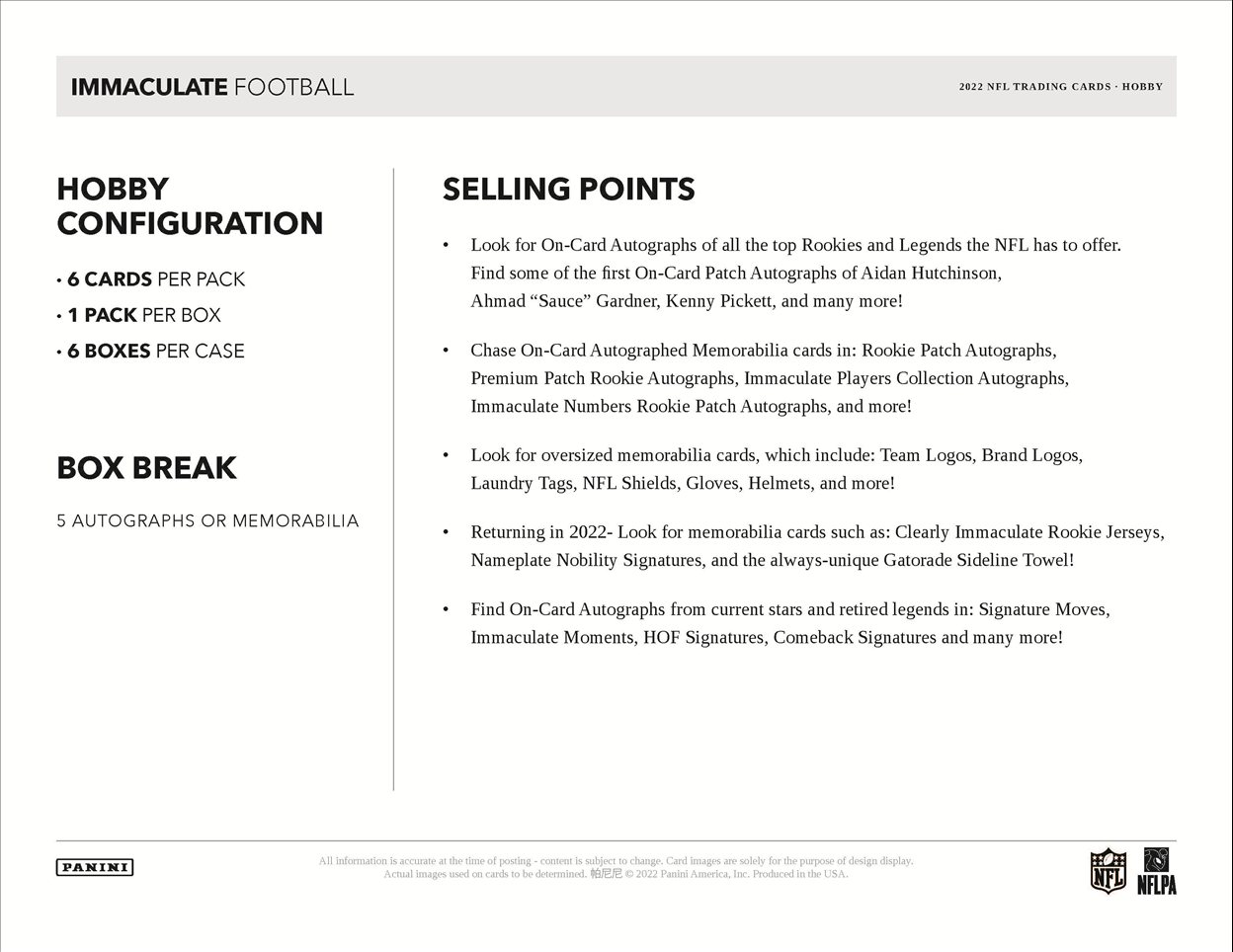 - NEW in 2022 Immaculate Collection- Hunt for Immaculate Milestone, featuring On-Card Autographs of the NFL’s top veterans and legendary players highlighting their career milestones!