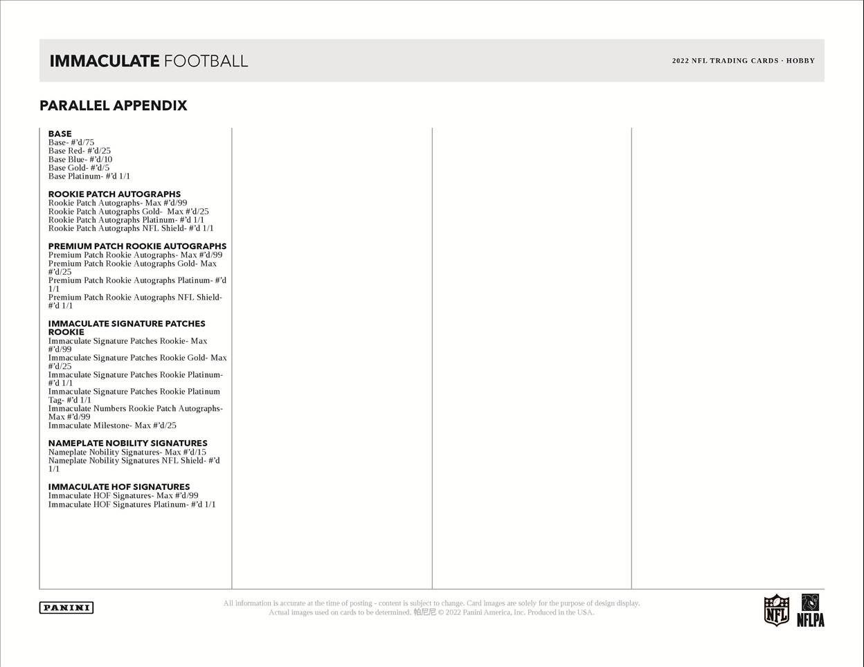 - Returning in 2022 Immaculate Collection- Chase the 1/1 Dual NFL Shield Signatures, featuring On-Card Autographs of iconic pairs of NFL stars!