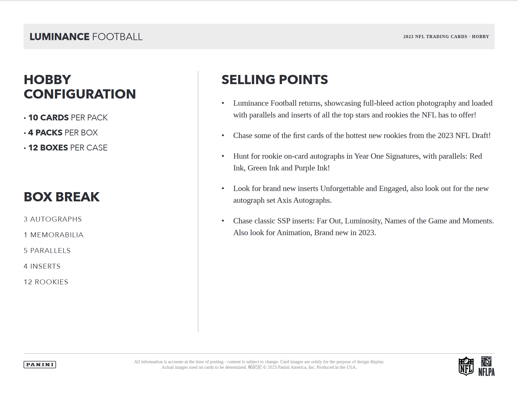 - Luminance Football returns, showcasing full-bleed action photography and loaded with parallels and inserts of all the top stars and rookies the NFL has to offer!