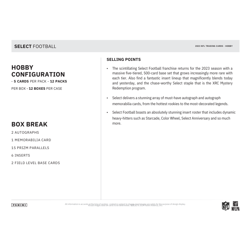 Base: - The scintillating Select Football franchise returns for the 2023 season with a massive five-tiered, 500-card base set that grows increasingly more rare with each tier. - Also find a fantastic insert lineup that magnificently blends today and yesterday, and the chase-worthy Select staple that is the XRC Mystery Redemption program.