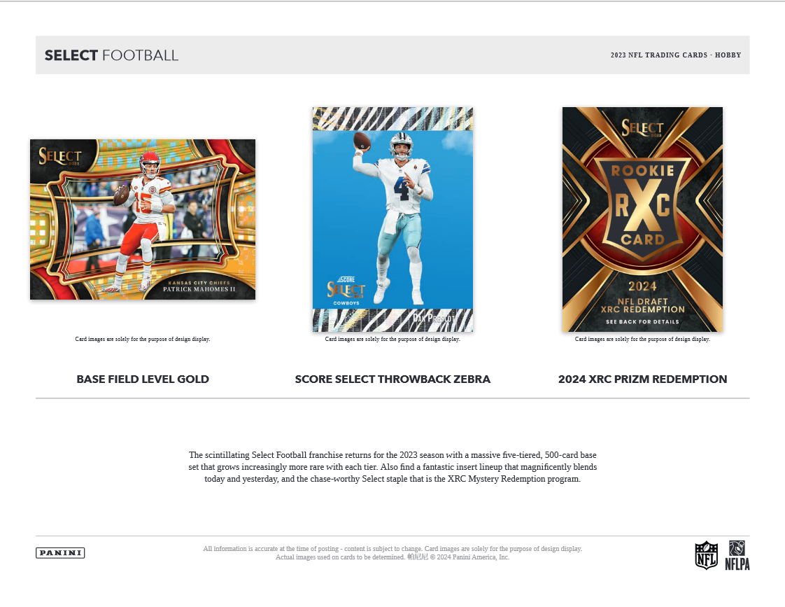 - The scintillating Select Football franchise returns for the 2023 season with a massive five-tiered, 500-card base set that grows increasingly more rare with each tier. Also find a fantastic insert lineup that magnificently blends today and yesterday, and the chase-worthy Select staple that is the XRC Mystery Redemption program.