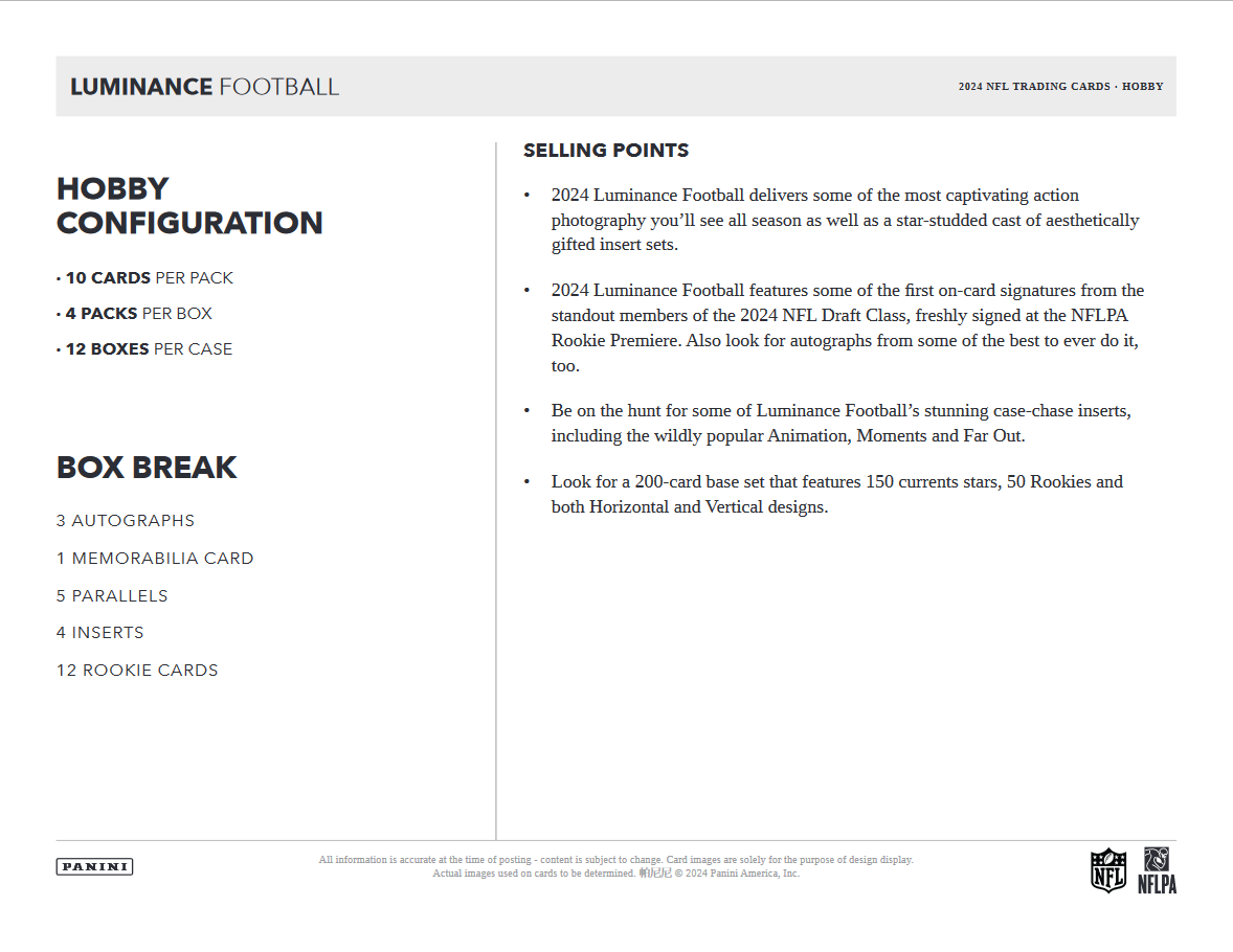 - 2024 Luminance Football features some of the first on-card signatures from the standout members of the 2024 NFL Draft Class, freshly signed at the NFLPA Rookie Premiere. Also look for autographs from some of the best to ever do it, too.