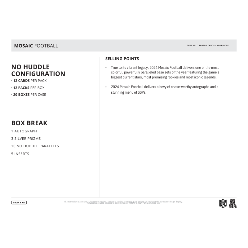 Base: - True to its vibrant legacy, 2024 Mosaic Football delivers one of the most colorful, powerfully paralleled base sets of the year, featuring the game’s biggest current stars, most promising rookies and most iconic legends.