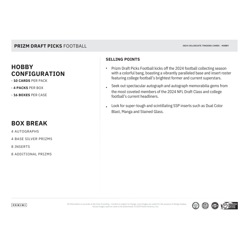 Base: - Prizm Draft Picks Football kicks off the 2024 football collecting season with a colorful bang, boasting a vibrantly paralleled base and insert roster featuring college football’s brightest former and current superstars.